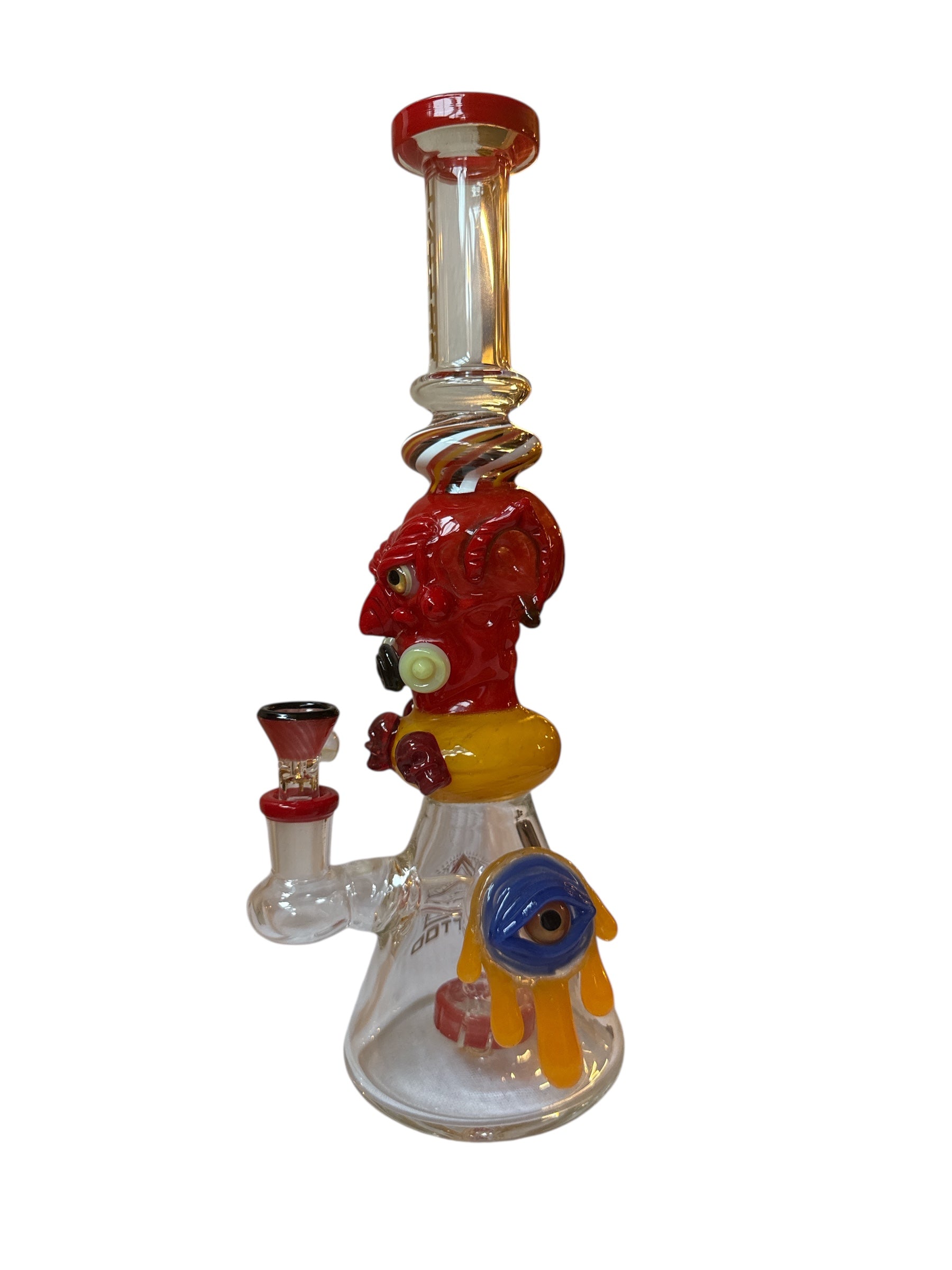 A handcrafted glass bong from the Lookah Tattoo collection, featuring a red devil head with striking details. Both a functional piece and a work of art, it’s made from strong glass and includes a high-quality percolator for smooth, clean hits.