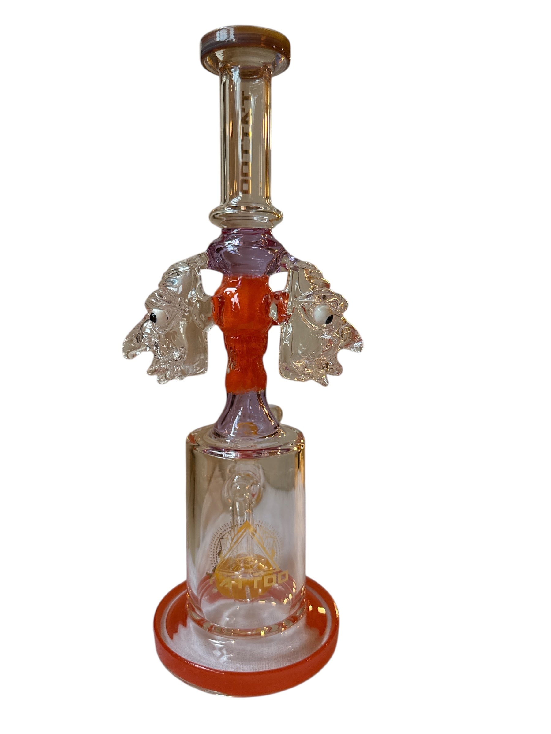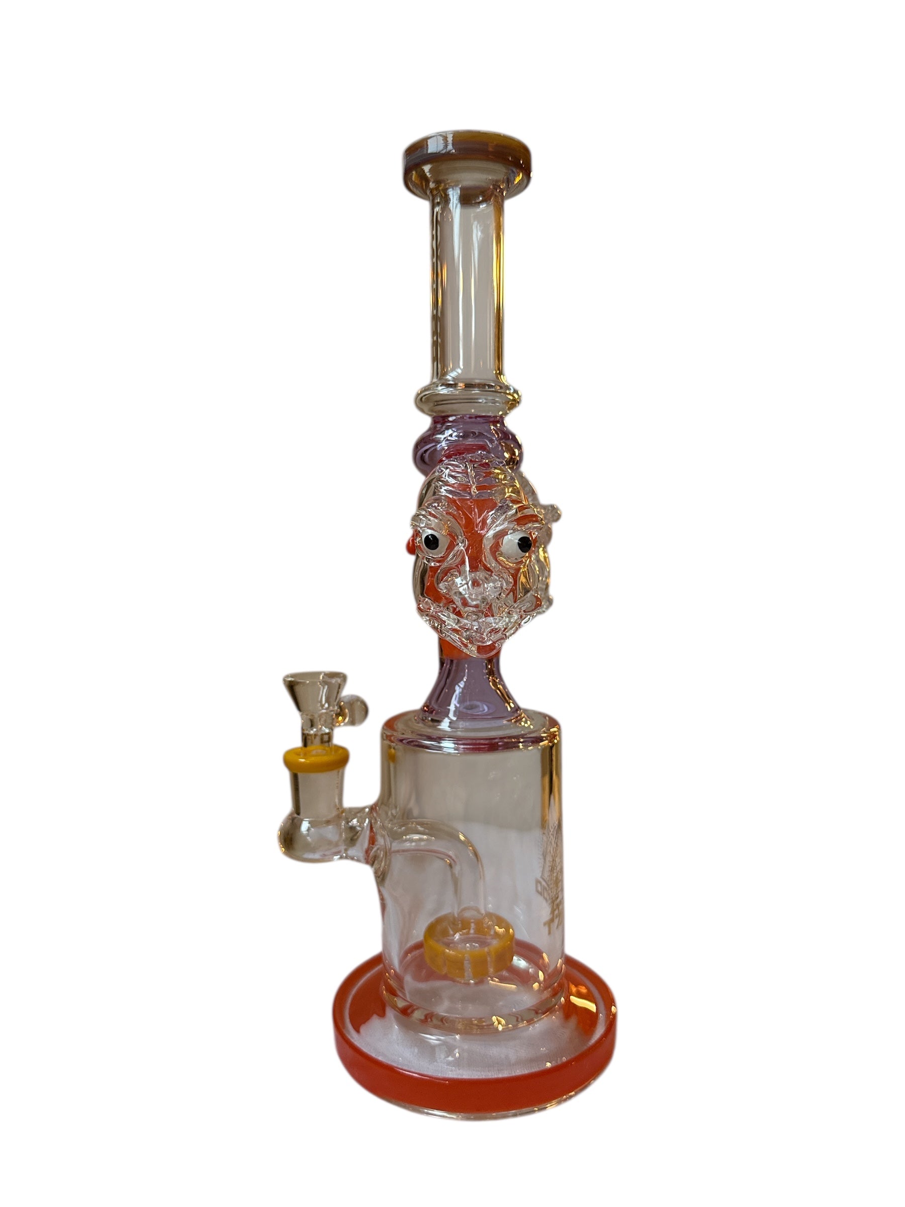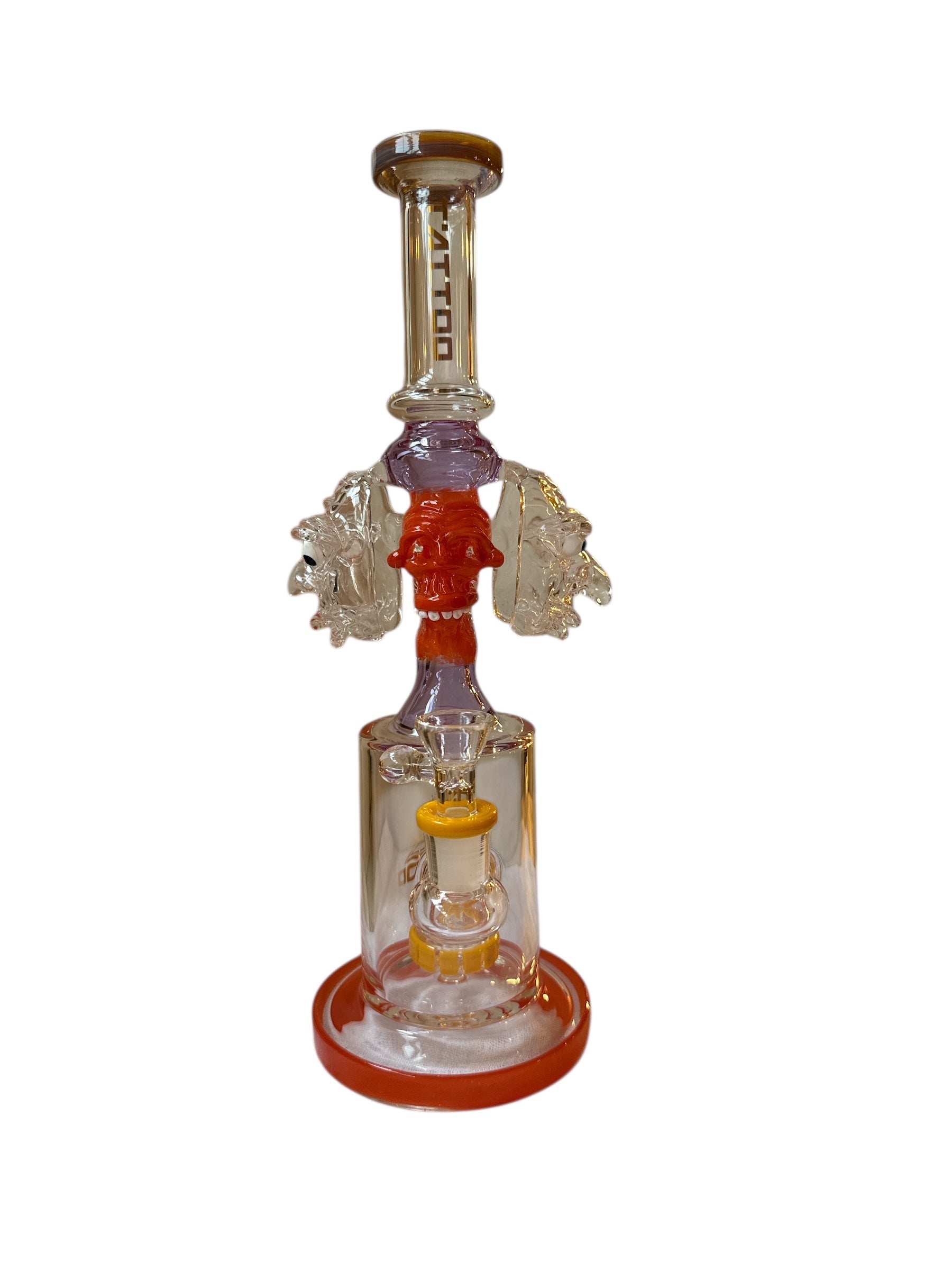 A handcrafted glass bong from the Lookah Tattoo collection, featuring three sculpted faces around the body. This unique piece of art is made from durable glass and includes a built-in percolator for smooth and clean hits. Perfect for collectors or anyone who wants a bong that truly stands out.