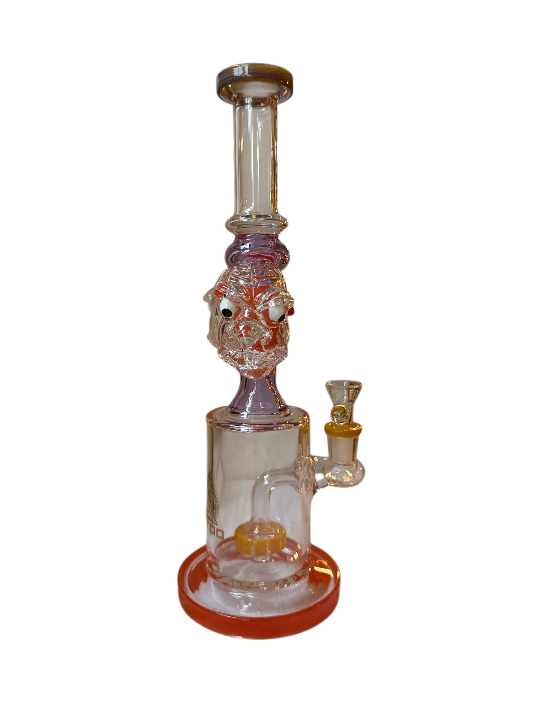 Handgert glerbong úr Lookah Tattoo línunni með þremur útskornum andlitum á hliðum. Einstakt listaverk úr sterku gleri með innbyggðum percolator fyrir mjúka og hreina upplifun. Þetta bong sameinar list og notagildi og er fullkomið fyrir safnara eða þá sem vilja skera sig úr.